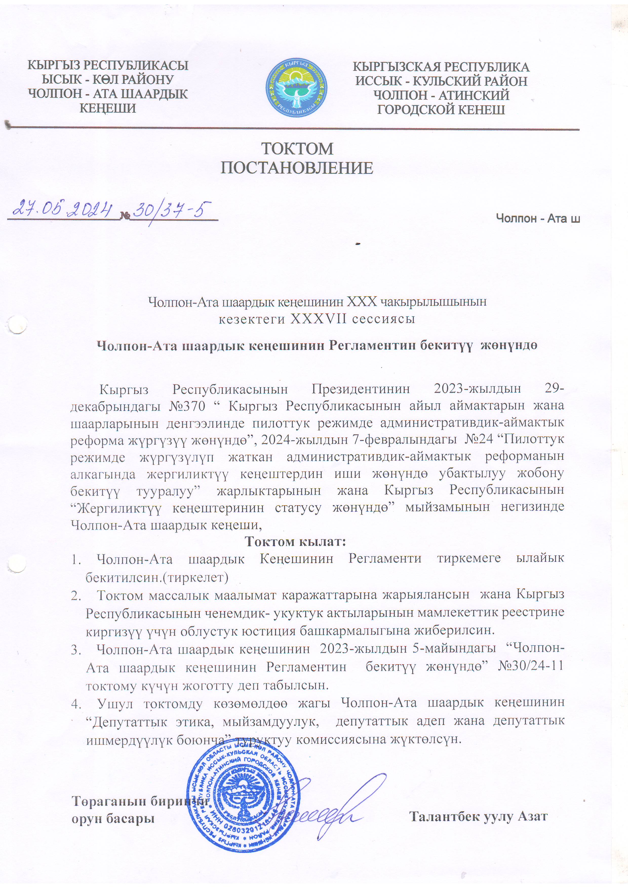 ЧОЛПОН-АТА ШААРДЫК КЕҢЕШИНИН 27/05/2024 №30/37-5 ТОКТОМУ