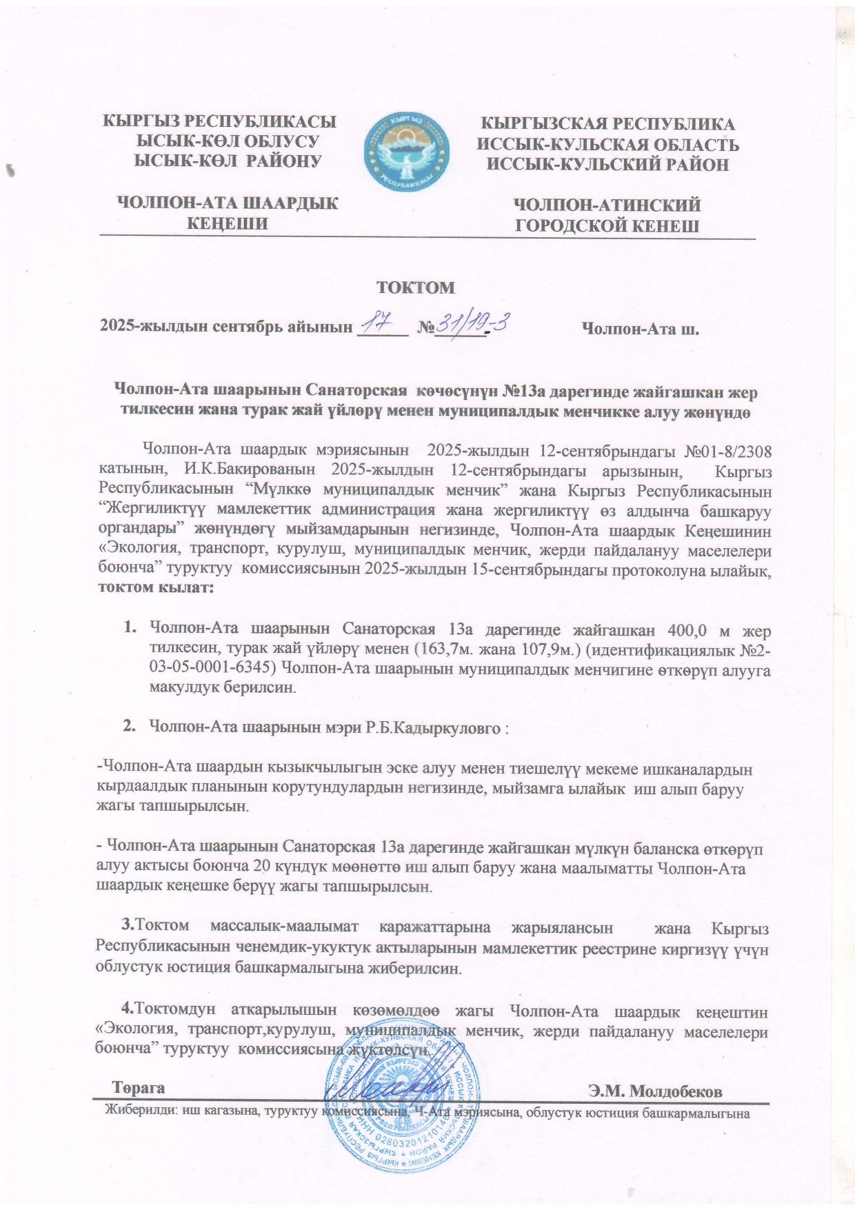 Чолпон-Ата шаардык кенешинин 2025-жылдын 17-сентябрындагы №31/19-3 Токтому