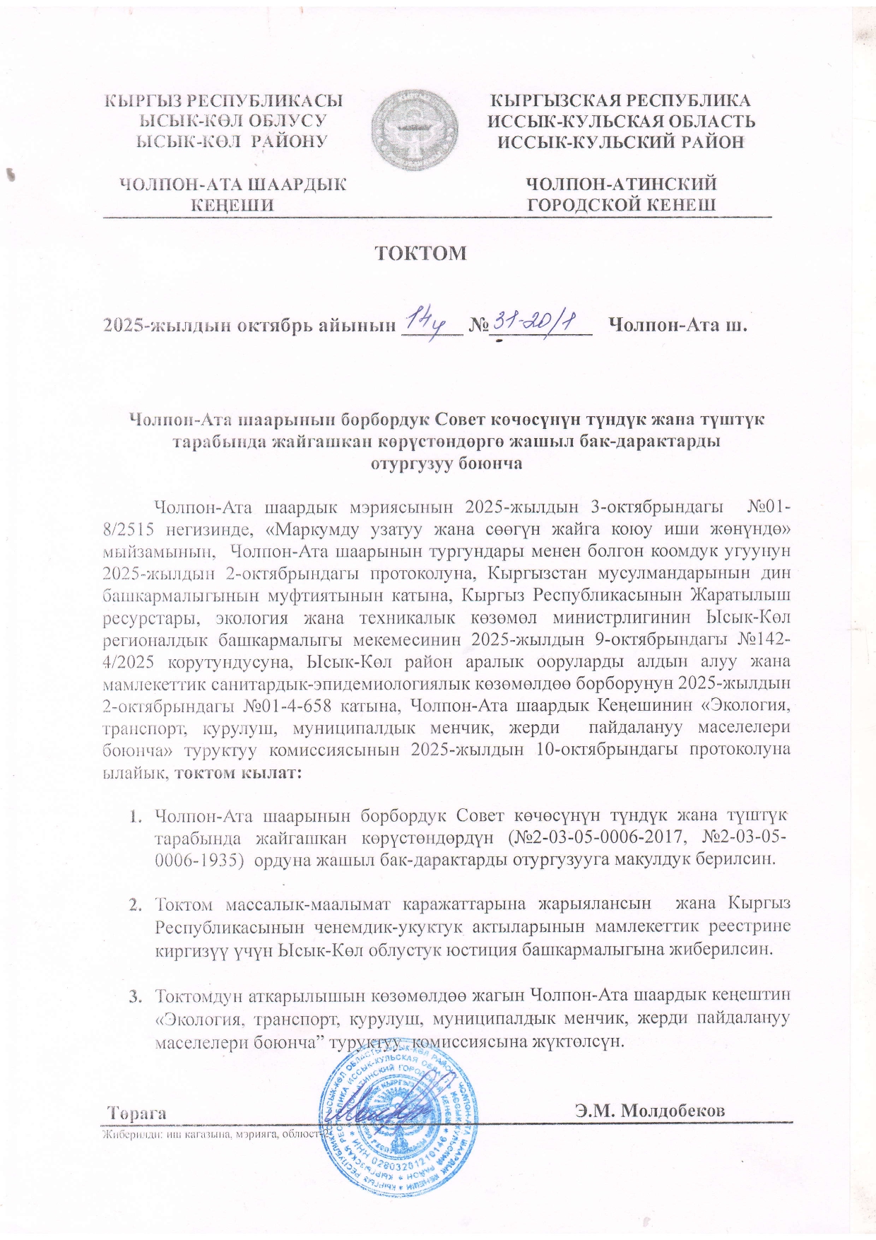 Чолпон-Ата шаардык кенешинин 2025-жылдын 14-октябрындагы №31-20/1 Токтому