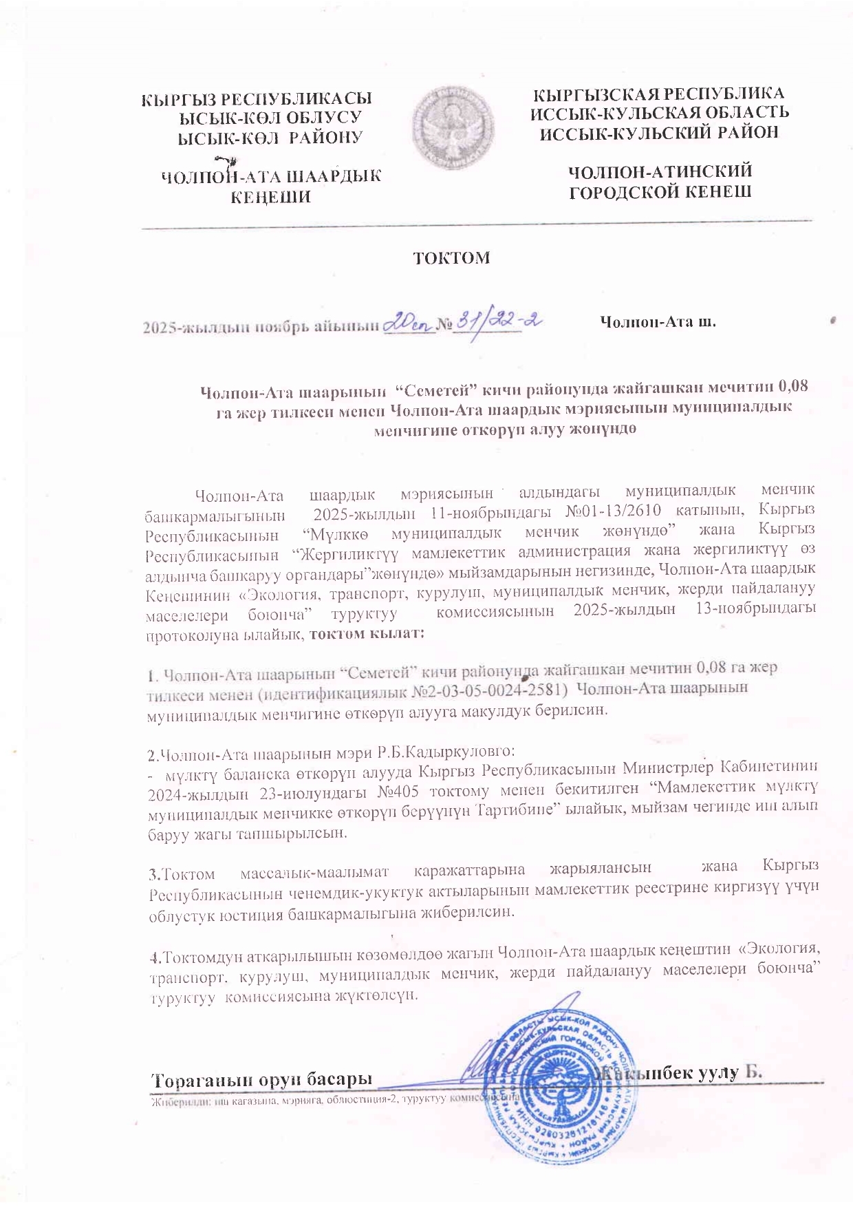 Чолпон-Ата шаардык кенешинин 2025-жылдын 20-ноябрындагы №31/22-2 Токтому