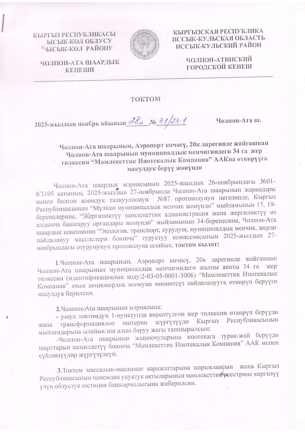 Чолпон-Ата шаардык кенешинин 2025-жылдын 28-ноябрындагы №31/23-1 Токтому