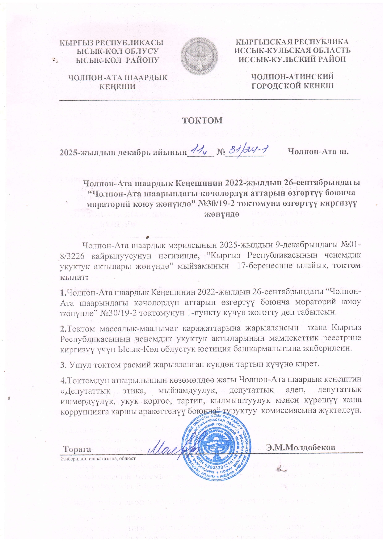 Чолпон-Ата шаардык кенешинин 2025-жылдын 11-декабрындагы №31/24-1 Токтому